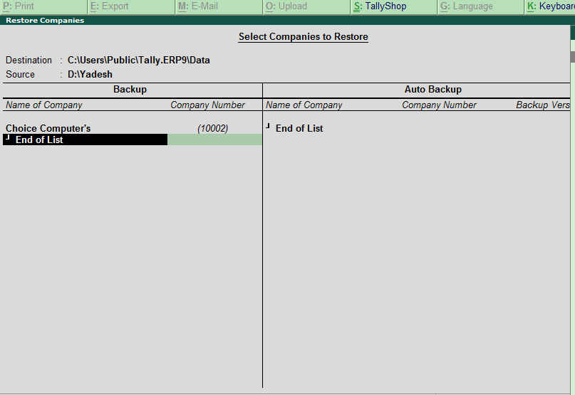 - Backup – हमारे द्वारा किये गए Accounting कार्य जिसका हम लेनदेन करते है उस Data को किसी अन्य जगह सुरक्षित रखने के लिए Backup Option का उपयोग करते है I ताकि बाद में जब कभी हमारे Data में कोई Error आये या गलती से Delete हो जाये तो उसको Restore किया जा सके I इसके लिए Shortcut Key B का उपयोग करते है I