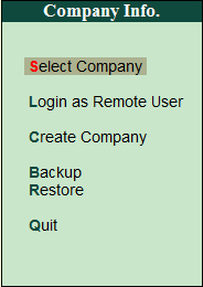- Select Company – पहले से बनी हुई कंपनी को खोलने के लिए Select Company Option का उपयोग करते है I इसके लिए Shortcut Key S का उपयोग करते है I