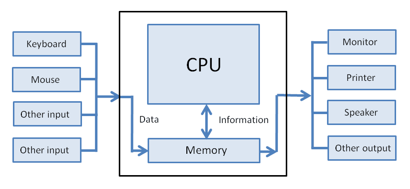 1.सी.पी.यू. (C.P.U.) :- इसका पूरा नाम सेंन्ट्रल प्रोसंसिंग यूनिट होता हैं। यह कम्प्यूटर का ब्रेन होता हैं। कम्प्यूटर की सभी डिवाइसे इसी से जुड़ी होती हैं। सी.पी.यू में ही सभी मुख्य तत्व जैसे फ्लॉपी, सीडी रोम, हार्डडिस्क, प्रोसेसर, मेमोरी आदि लगे होते हैं।